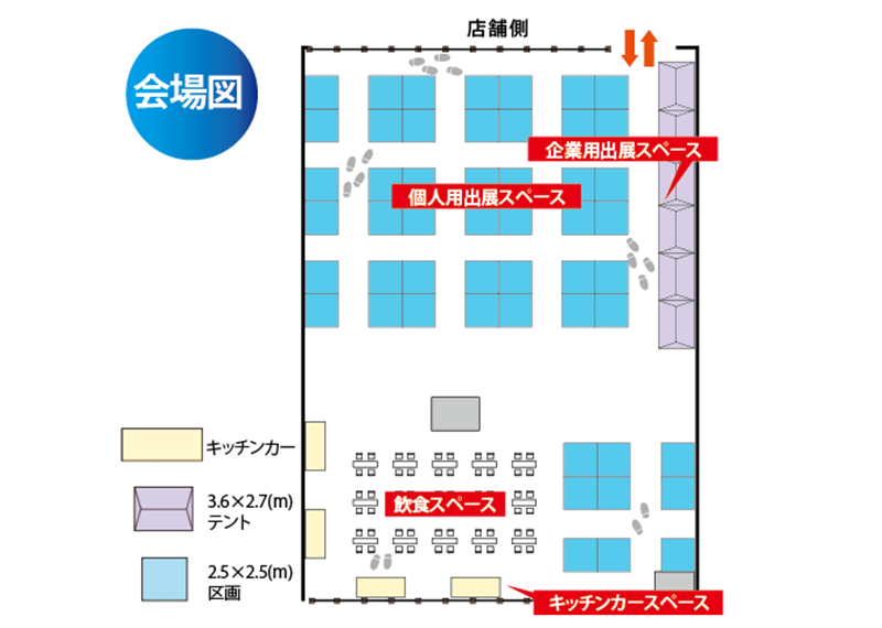 企業ブースのみ、テント設置してあります。個人ブースはテントなし、お持ち込みテントは必ず(2.5m×2.5m)以内としてください。それ以上の大きさのテントは事務局で撤去させていただきます。